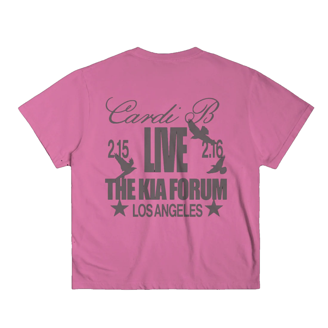 Celebrating the two sold out shows at the Kia Forum! This tee features a photo of Cardi and the Kia Forum, with her name and the dates on the back.